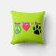 Graphique mignon en couleurs néons colorées. 3 symboles - un signe de paix, un coeur et une patte, avec les mots paix, amour et pattes. Pour les propriétaires d'animaux de compagnie qui aiment la paix.