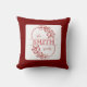 Elevate your home decor with this elegant and timeless personalized family name throw pillow. Featuring a chic deep red and white color palette, this design showcases a delicate botanical wreath surrounding your custom surname in a sophisticated serif font.