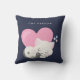 Un coussin avec une adorable illustration graphique. Un chaton blanc avec une jolie image empreinte de patte sur sa fourrure. Dormir tranquillement. Un grand coeur rose derrière elle et quelques petites étoiles aussi. Texte : Personne de chat. Arrière - plan bleu foncé.