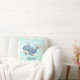 Cet oreiller de jetée personnalisé pour enfants présente une mignonne baleine blanche dans un coloris rose et bleu éclatant nageant avec un casquette minuscule.