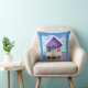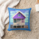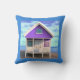 Coussin décoratif dans une petite cabane de plage / maison de vacances sur pilotis, peinte en blanc et violet, sur le sable, avec un ciel bleu et des nuages blancs