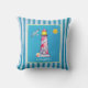 Une coussin à thème nautique. Conçu avec un motif rayé bleu et un cadre bleu avec une bordure jaune superposée. Un phare rayé rouge et une boule de plage, un soleil souriant et une mouette volante au loin positionné à l'intérieur du cadre. Personnalisez avec un nom ou un autre texte.