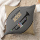 Musique cool thème accent lancer oreiller fait dans un arrière - plan gris, avec deux coins fait dans le bronzage. Les graphiques d'une silhouette de trompette, avec des accents colorés et la lecture de texte personnalisée, font du bruit, et peuvent être personnalisés pour lire ce que vous voulez.