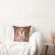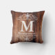 Obtenez un élégant, rustique, ferme chic look pour votre salon ou chambre à coucher avec cet oreiller à jetons personnalisé. Il a un arrière - plan de planches en bois brun foncé, des parchemins tourbillonnant blancs, des accents de cadrage haut et bas, ainsi que votre lettre monogramme personnalisée et le texte du nom de famille en blanc.