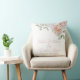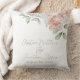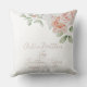 Ce coussin à mariage floral romantique dispose d'un arrière - plan blanc élégant et simple avec pêche à l'aquarelle et fleurs blanches. Un bouquet délicat est représenté sur le dessus. Des exemples de noms de couple sont imprimés ci-dessous dans une police de script élégante.