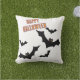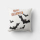 Améliorez votre espace de vie extérieur avec ce coussin d'Halloween saisonnier. Il présente une conception de chauve-souris noire avec le salut "Happy Halloween" en orange, souligné en violet. Ce coussin extérieur résistant aux intempéries est adapté à un usage intérieur et extérieur.