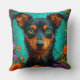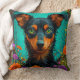 Oreiller décoratif vibrant avec un portrait de chien stylisé sur un fond floral sarcelle. Parfait pour la décoration intérieure, les sièges d'appoint, les amateurs d'animaux de compagnie et les intérieurs colorés à la recherche de détails d'art moderne ludiques.