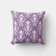 Carreau décoratif avec un motif pourpre de damassé. Fait main aux Etats-Unis. Grand coussin de coton avec une conception vintage de damassé dans le blanc sur un arrière - plan pourpre.