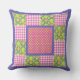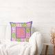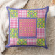Un chic Throw Oreiller ou Cushion, avec un joli motif de primroses profondes, bleu violet et jaune sur un arrière - plan vert feuillu, en équipe avec en vichy chèque rose et blanc profond et un motif de primroses jaunes et pois verts sur un arrière - plan rose profond; de la collection Posh & Painterly "Primroses".