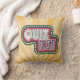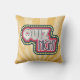 Coussin de la soirée Quiz. Avec une grosse typographie audacieuse entourée de lumières de dressing. L'arrière - plan est un motif de sunburst jaune.