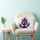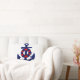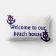 Décorations de maison de plage. Coussin décoratif de thème nautique avec le bleu marine et les ancres et la balise de rouge. Amusement pour des enthousiastes de canotage et de navigation ou des maisons de lac et des maisons de plage. Le modèle personnalisé des textes qui indique l'accueil à notre house de plage est facilement changé ou entièrement supprimé avant l'achat. Coussin fait américain de Mojo.