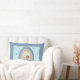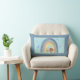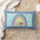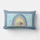 Ce coussin lombaire a un arc-en-ciel moderne avec deux chiens de chiots fantaisistes debout sous lui. La rangée supérieure de l'arc-en-ciel a petit chien chiot imprime l'escalade des deux côtés menant à un coeur sur le dessus. Il y a différents os de chien colorés éparpillés autour. Arrière - plan est un bleu ciel pâle avec une bordure jaune puis un bleu foncé. Grand coussin pour maman en pépinière tout en secouant le bébé!
