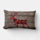 Un cabine de bois d'hiver à thème lancer l'oreiller avec un arrière - plan de la grange de bois récupéré avec un renne de cerf à motif de buffle rouge sous un léger poussif de neige. L'arrière comporte un petit motif de répétition du même grand cerf.
