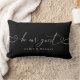 Modern trendy script calligraphy with flourishes reading "Be our guest" on this elegant black and ivory lumbar throw pillow, perfect to welcome guests to your home, vacation rental, or bed and breakfast.