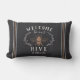 Bienvenue aux invités avec ce mignon oreiller à thème d'abeilles avec une illustration d'abeilles de style vintage ornée de feuilles botaniques et de garnitures de corde. "Bienvenue dans notre ruche" apparaît en lettrage ivoire. Personnalisez avec votre nom de famille le long du bas.