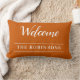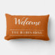 Élégant coussin personnalisé caractéristiques "Welcome" en écriture blanche typographie sur arrière - plan orange brûlé avec le nom de famille pour fournir un accueil chaleureux à vos invités. Je vous souhaite un automne chaleureux et cosy avec toute la joie que la saison apporte. Bon appétit !
