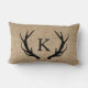 Coussin personnalisé de lettre initiale. Ce coussin lombaire de toile de jute de faux est orné avec des andouillers encadrant un monogramme de votre choix.