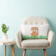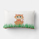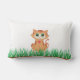 Joli chat roux tigré et plante d'herbe sur un coussin décoratif blanc.