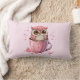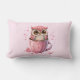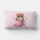 Coussin avec l'adorable image d'un hibou assis dans une tasse à café. Des coeurs se balançant et un seul rose placé au fond de la tasse.