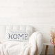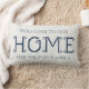 Extend a warm and personalized welcome to your guests with this stylish and cozy lumbar throw pillow. The design features the phrase "WELCOME TO OUR HOME" in an elegant, simple blue font, complemented by the main text "HOME" which utilizes a unique, charming pixelated or cross-stitch style typeface. Below, there is space to add your family's name, as indicated by "THE WILSON FAMILY" placeholder, making it a perfect customized piece of home decor. This pillow is an excellent accent piece for a sofa, armchair, or bed, blending classic hospitality with a modern, slightly rustic design aesthetic. The crisp blue and white color scheme fits effortlessly into various interior design styles, from coastal to farmhouse chic. Create a welcoming atmosphere in your entryway or living room and customize yours today!