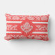 Joli coussin de style lombaire à coordonner avec les autres coussins carrés avec les mêmes teintes orange saumon de couleur avec blanc dans les motifs damassés avec des accents rayés audacieux. Votre monogramme est présenté sur un côté et offre à votre patio ou décor de porche un look gai et tropical pour les mois chauds.