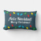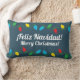 Un design coussin de Noël amusant en espagnol et en anglais. Il dit "¡Feliz navidad!" et "Joyeux Noël." Le design est très festif avec des lumières de Noël.