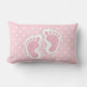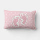 Un coussin lombaire avec une adorable image d'empreintes de filles roses avec un contour blanc épais. Pois blancs sur un arrière - plan rose derrière l'illustration.
