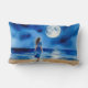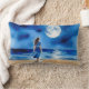 Lumbar Coussin dans l'illustration d'une jeune femme solitaire en robe bleue debout au bord d'une plage, regardant la pleine lune réfléchissant sur l'océan. Le ciel nocturne serein est parsemé d'étoiles.