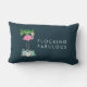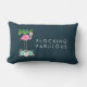 Coussin avec l'illustration d'un flamant rose avec des palmiers verts derrière et debout sur un lit de fleurs florales succulentes. Tropical et joli. L'arrière - plan est bleu foncé. Le texte dit Flocking Fabulous.