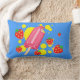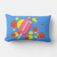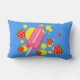 Une coussin lombaire sur le thème de l'été. Conçu avec un popsicle rose et quelques fraises rouges et éclaboussures de peinture jaune. Arrière - plan bleu.