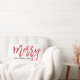 Un oreiller lombaire blanc moderne avec un "Joyeux" surdimensionné en rouge gras écriture manuscrite avec un nom de famille en majuscules propres en dessous. La typographie manuscrite saisissante crée un accent de Noël frais et contemporain qui se démarque sur les canapés, les bancs et la literie de Noël. Personnalisez avec le nom de votre famille pour un souvenir saisonnier significatif ou un cadeau de Noël.
