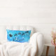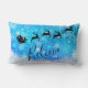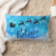 Coussin lumbar de Noël avec une silhouette noire de père Noël dans son traîneau tiré par son renne volant à travers le ciel. Croyez écrit dans une police de script tendance. L'arrière - plan est un modèle de flocon de neige glacé bleu glacé.