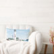Ce dessin présente un phare blanc, vert et noir qui surplombe la mer. Le ciel est bleu avec quelques nuages. Des maisons blanches aux toits verts entourent le phare. L'arrière du coussin est le même que l'avant. Ce design est disponible sur différents styles et tailles.