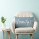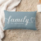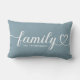 Un oreiller lombaire bleu poussiéreux personnalisé avec Famille en écriture cursive blanche en forme de cœur avec un monogramme de nom de famille personnalisable. Le design blanc sur bleu poussiéreux apporte une accent calmant et serein aux salons, chambres ou espaces d'inspiration côtière. Tout le texte est entièrement modifiable pour personnaliser avec le nom de famille. Un beau cadeau de pendaison de crémaillère ou de famille.