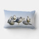Cet oreiller décoratif à jetons présente six mouettes grises et blanches rassemblées au bord de l'eau par beau temps. L'image est répétée à l'arrière.