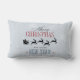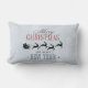 Un coussin de Noël festif. Un arrière - plan gris subtil avec des flocons de neige. Lettres tendance qui dit : Joyeux Noël et Bonne Année. Avec une silhouette noire de père Noël dans son traîneau tiré par son renne volant à travers le ciel.