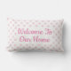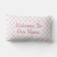 Accueillez vos invités à votre maison avec un coussin blanc et rose d'accent. Le texte "accueil à notre maison" est placé dans la police rose à la mode. Le motif d'arrière - plan est pois rose et blanc pour ajouter un peu d'amusement espiègle à votre chambre d'amis.