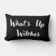 Joli coussin noir et blanc avec typographie. Texte : What's Up Witches. Ce tapis de portes festif et amusant est parfait pour octobre et Halloween. Le mat est noir et la typographie est un script blanc.