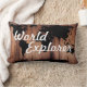 Un monde noir rustique et ancien carte silhouette sur une grange sombre planches en bois arrière - plan avec les mots "World Explorer" dans un épais script blanc. Cet oreiller est idéal pour un bureau à domicile, une bibliothèque ou votre fauteuil de lecture préféré.