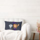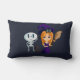 Un coussin lombaire avec une mignonne sorcière portant un grand casquette de sorcières violettes. Sa chatte noire se reposant sur le dessus de sa tête. Elle a de longs cheveux orange et porte un balai. A côté d'elle, un squelette amusant souriant et saluant. Belle illustration de dessin animé parfaite pour l'halloween.