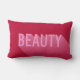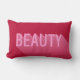 Coussin rose avec un design abstrait moderne du mot "Beauté" avec un long dégradé d'ombre. Ajoutez une touche amusante à votre maison ou dortoir avec cette coussin moderne. *Veuillez noter que le filigrane Zazzle qui apparaît dans l'aperçu du zoom n'apparaîtra PAS sur le produit imprimé final. © Bois de rose et agrumes
