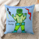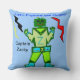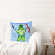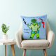Personnage de dessin animé Captain Zacky, garçon alien vert cool sur le devant de l'oreiller sur un fond bleu clair. Arrière de l'oreiller PERSONNALISEZ la zone de texte pour insérer le nom de l'enfant. Mignon, le robot vert souriant Captain Z est venu dire bonjour, avec une tenue jaune et verte, des bottes spatiales bleu clair et l'apparence de lumières colorées 3D comme accessoires, et des éclairs jaunes, noirs et rouges. Œuvre originale © 2014 TamiraZDesigns. Tous droits réservés.