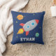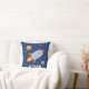 Ajoutez un sentiment d'aventure pour une chambre d'enfants, avec cet oreiller coloré qui projette un vaisseau-fusée explosant dans l'espace entre les étoiles et les planètes à travers un arrière - plan bleu foncé. Une pièce décorative amusante pour une chambre pour garçons. Personnalisez avec le nom de l'enfant.