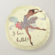 Coussin ronde avec un design de ballerine noire sur un arrière - plan jaune pâle, avec les mots "I Love Ballet", ajouté. La ballerine danse dans un faux cercle doré de cercles, et il y a des étoiles ici et là. Merci à Creative Fabrica pour certains des éléments du design.