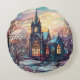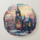 Un charmant coussin rond à l'image d'une église d'hiver en vitrail.