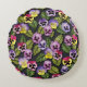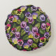 Cette coussin ronde est décorée de motifs floraux avec des panneaux violets et jaunes sur un arrière - plan bleu-gris foncé, parfait pour un jardinier ou un amoureux des fleurs !