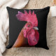 Rooster chicken pillow (black background). Colorful and very detailed. Side profile. Brown feathers. Mesmerizing, captures an audience.