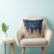 "Coussin décoratif Monsieur et Madame Forêt d'hiver pailleté rose gold." Fond en bois lavé bleu marine riche avec des arbres de la forêt pailletés de rose gold sur une colline enneigée avec trois cerfs et des flocons de neige stylisés. Toutes les œuvres d'art créées par l'artiste et designer licencié internationalement, Audrey Jeanne Roberts, copyright.
