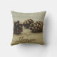 Conception coussin rustique avec trois pinecones sur la texture bois avec un modèle texte personnalisable. Parfait pour ajouter votre nom de famille ou un texte spécial. Décor chaleureux et d'inspiration nature pour les chambres de style cabine, ferme ou boisé.
