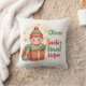 This fun, personalized throw pillow features a sweet baby elf peeking out of a festive red and green gift box with sparkling snowflakes.